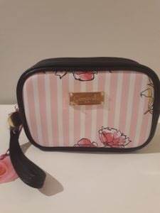 pochette in safiano con manico a polsiera staccabile, chiusura lampo, foderato e lavabile